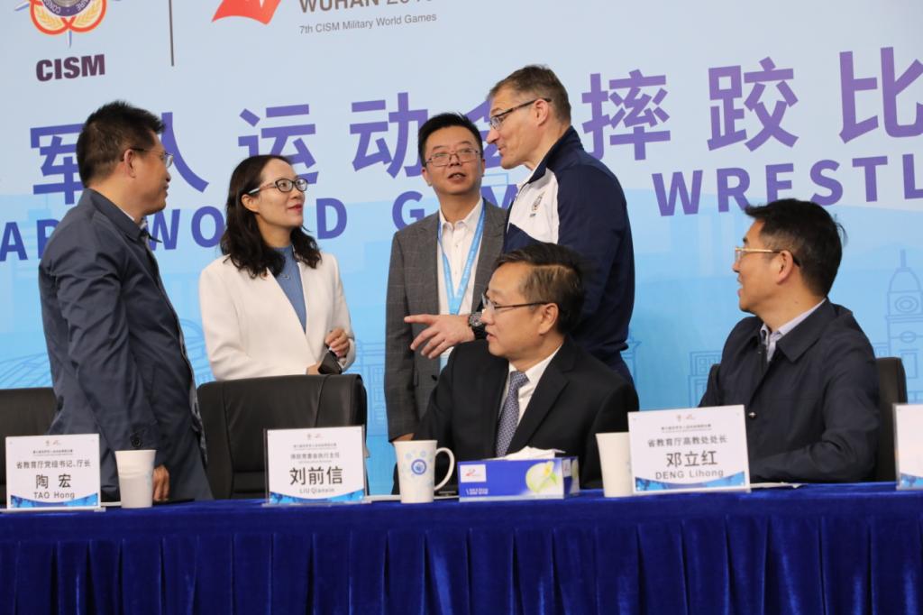 陶宏厅长早早地来到摔跤场馆,与国际军体摔跤项目委员会主任马尔科•科佩拉亲切交谈,在得知摔跤赛事工作得到国际军体、国际摔联的一致认可和好评时,十分高兴地称赞武软师生出色的工作。他说,中国“八一”摔跤队不畏强手、敢于拼搏、勇夺金牌的精神值得广大师生学习,这次摔跤比赛正是进行爱国主义教育最好的一课。他鼓励大家再接再厉,为军运会摔跤赛事画上圆满句号,并用这种全力以赴、精益求精的精神做好今后的工作,更好地推进学校优质发展。