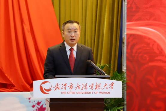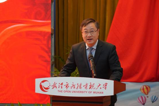 校党委书记马蜂教授致辞。他介绍,武汉电大经历了“边上马、边备鞍”的建校历程,勤俭建校,创设办学条件,从无到有、从小到大、从激情到理性、从摸着石头过河到通过反复试验有序推进的艰辛探索历程。40年来,学校始终牢记自觉适应和服务地方经济建设和社会发展需要,努力办人民满意的教育这一根本宗旨;始终坚守“没有围墙的大学”这一初衷;始终坚持充分发挥系统办学优势、稳步发展学历教育、质量立校和名师施教的质量关、关注和应用先进技术。面对未来,武汉电大人将坚守育人初心,勇担教育使命,努力创办全国一流开放大学,奋力谱写新时代高质量发展的新篇章,为构建全市终身教育体系,建设“学习武汉”,为武汉建成国家中心城市、为湖北“建成支点,走在前列”再立新功。