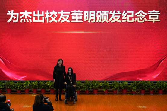 优秀校友及学生代表发言。优秀校友代表,全国道德模范、全国自强模范董明介绍,这些年从事志愿服务帮助了7000多人,挽回了300多条绝望的生命,在第六次全国自强模范暨助残先进表彰大会上得到习近平总书记的称赞。“感恩母校给予我知识和力量,陪我度过奋斗无悔的青春和别样的精彩”,她表示,“我要通过努力和坚持,将爱祖国、爱母校的精神传承下去,教书育人,立德树人,继续为学校争光”。