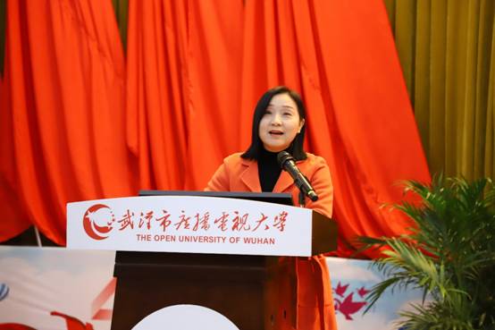 国家开放大学党委副书记、纪委书记刘向虹同志发表讲话。她表示,近年来武汉电大招生规模节节攀升,“六网融通”人才培养模式不断优化,“四级”社区教育网络逐步形成,示范性分校建设项目有序推进,开放教育与职业教育融合发展,探索出一条终身教育的武汉模式。未来,她希望师生共同努力,推动新发展、实现新跨越,继续探索具有武汉特点的中心城市广播电视大学功能作用与发展模式,为武汉的广大学习者提供更加及时、便捷、有效的优质教育服务,为武汉经济社会发展和终身学习的教育体系构建作出新的贡献。