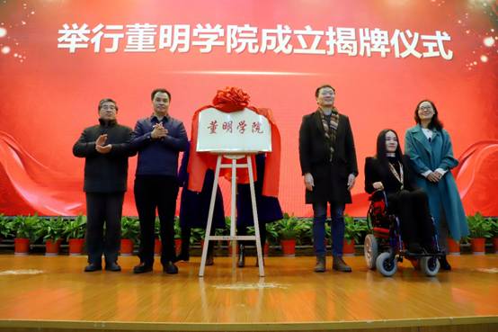 武汉城市职业学院校长邓院方教授,共青团武汉市委副书记叶仁杰同志,我校副校长万国邦教授、副校长孙美华同志为“董明学院”揭牌。董明学院的成立是学校融合残疾人教育、志愿者培训及服务的创举,今后将广泛开展志愿者专业培训及服务工作、继续深入开展残疾人教育,将其打造成武软志愿服务的一张响亮的名片。