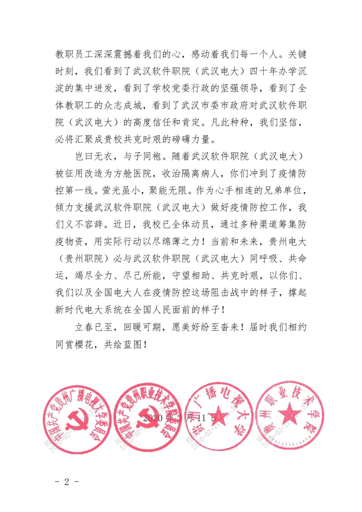 2月12日,贵州电大官微推出题为“天台立本情无隔,一树花开两地芳”的文章,再次深情祝福武汉电大(武软);2月11日又专程发函,表达关键时刻的坚定声援“必与武汉电大(武软)同呼吸、共命运、竭尽全力、尽己所能,守望相助、共克时艰,以你们、我们以及全国电大人在疫情防控这场阻击战中的样子,撑起新时代电大系统在全国人命面前的样子”;