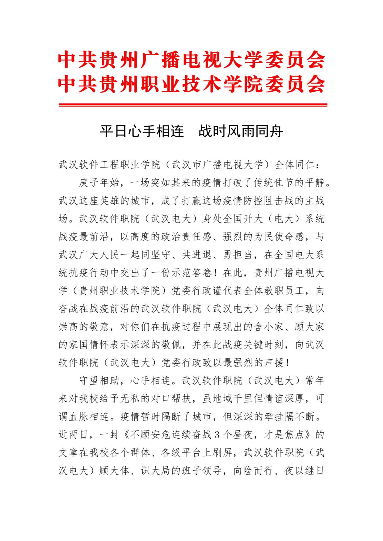 “平日心手相连,战时风雨同舟”。2月11日,这封来自醉美多彩之乡的声援信迅速传遍我校师生微信群。其时,我校在汉教职工在疫情肆虐、公交禁行的情况下,仅凭一片单薄的口罩从三镇自行驱车,向险而行、紧急赶往三环之外的光谷校区,三天两夜不眠不休,紧急2000个床位为隔离治疗点。贵州电大获悉后第一时间表达最强声援: