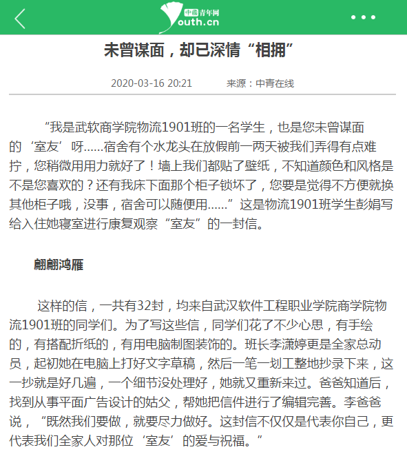 身在各地的武软学子通过各种途径“共享”这堂思政课,感触良多。汽修1902班的汤文凯说:“看到同学们纷纷向‘室友’写信,花了很多心思隔空投递祝福,让我十分感动。在这次大灾大难面前,有无数的感人事迹、无数的爱心人士,体现了中华儿女的团结友爱,什么困难都压不倒的中国精神。” 通信1902班高珊写道:“面对疫情,医者勇担使命,坚守在疫情防控最前线;作为学生上不了前线,但我们可以献出自己的爱心和温暖,比如把宿舍腾出给康复人员用来隔离观察。虽然素不相识,但我们希望通过一封封信件传递爱与关怀。春天已经来临,让我们坚持取得最后的胜利!”