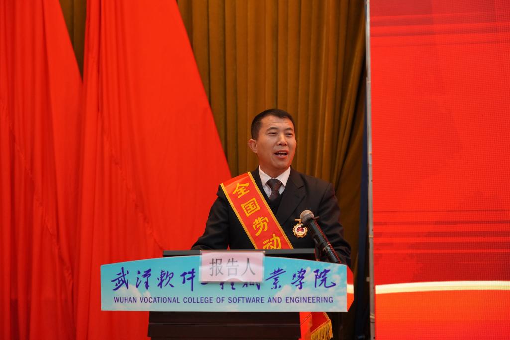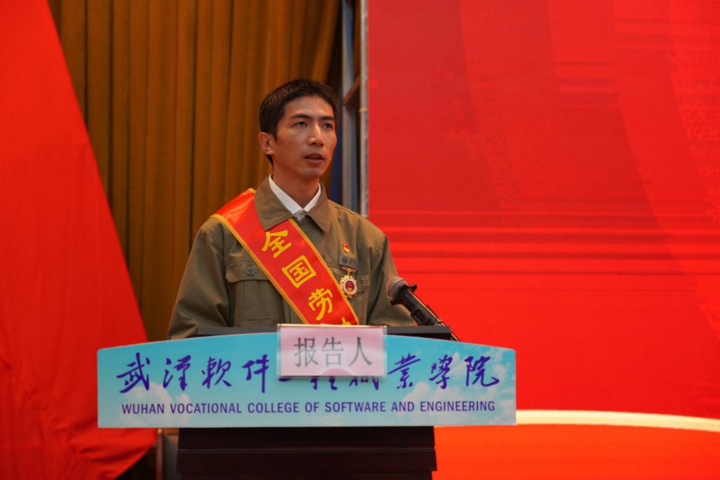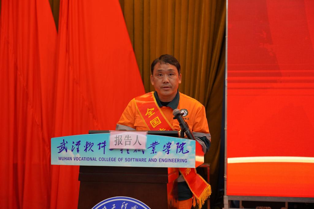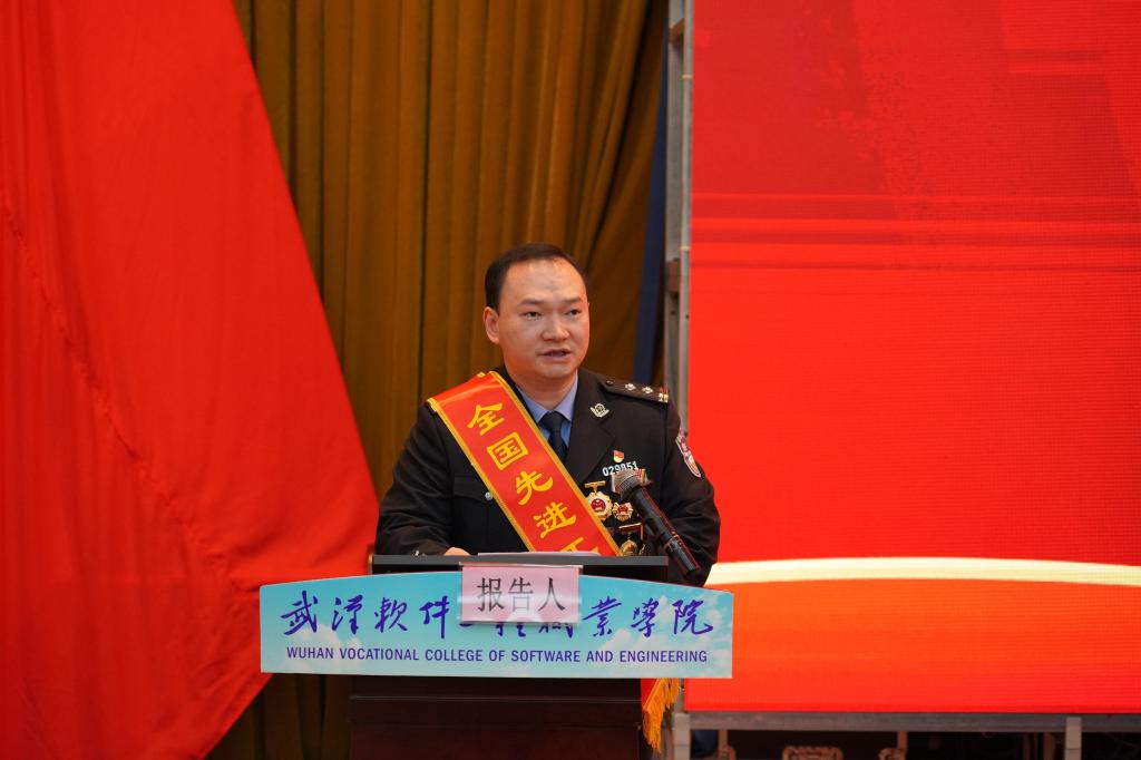 上午10点,在学术楼1号报告厅,国网湖北省电力有限公司检修公司输电检修中心带电作业二班班长胡洪炜、武汉市公安局汉阳区分局武汉国际博览中心派出所副所长廖宗安、武汉市东西湖区城市管理执法局吴家山城区管理所操作员罗善善、湖北省生态环境厅驻鄂东生态环境监察专员办副主任涂超、荆门市东宝区牌楼镇来龙村党支部书记胡为义、中国人民解放军第5713工厂技术与培训中心特种工艺专家孙红梅,分别上台讲述自己的事迹和工作中的所思所感。