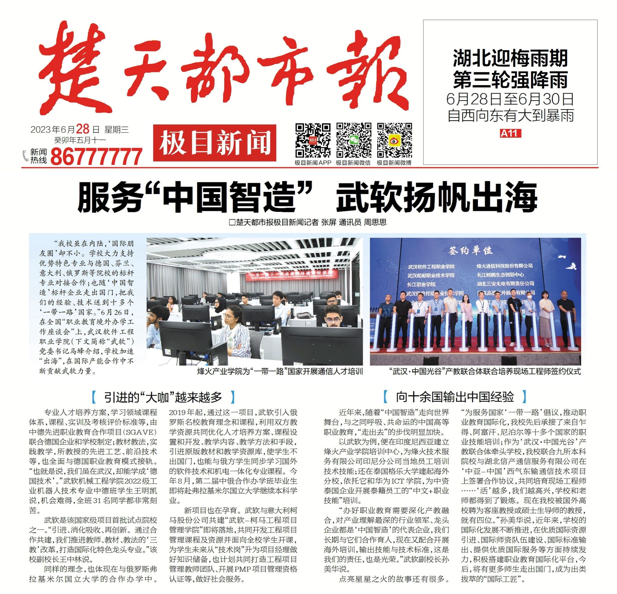 “我校虽在内陆,‘国际朋友圈’却不小。学校大力支持优势特色专业与德国、芬兰、意大利、俄罗斯等院校的标杆专业对接合作;也随‘中国智造’标杆企业走出国门,把我们的经验、技术送到十多个‘一带一路’国家。”6月26日,在全国“职业教育境外办学工作座谈会”上,武汉软件工程职业学院(下文简称“武软”)党委书记马蜂介绍,学校加速“出海”,在国际产能合作中不断贡献武软力量。