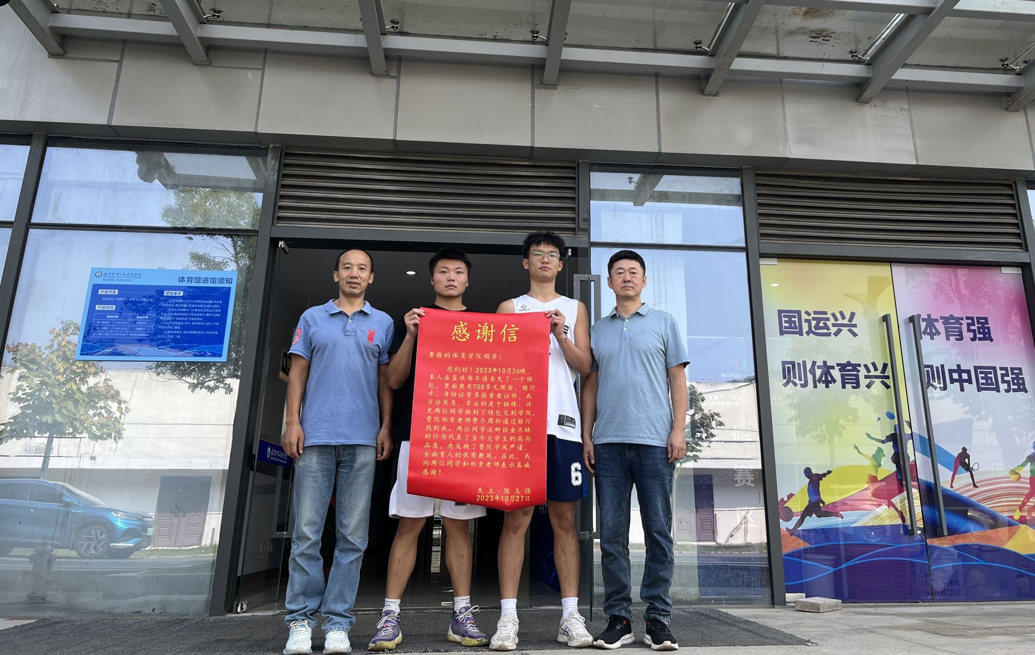 10月26日晚上,体育学院余铭峰和许光两名同学在运动场捡到一个钱包,包中有700元现金、身份证、银行卡等重要物品。当时周围没有人,他俩立刻找到学生科科长郑青老师,把钱包交了上去。郑老师又想了很多办法,最后终于找到陈玉强老师的手机号码,马上联系他将钱包归还。陈老师是来我校交流访问的,在篮球场看同学运动时不小心丢失了钱包,焦急万分,这么快又失而复得,他十分感动,于是向学院送来了感谢信,在信中说:“两位同学这种拾金不昧的行为代表了当今大学生的高尚品质,也反映了贵院学风严谨,全面育人的优秀教风”。