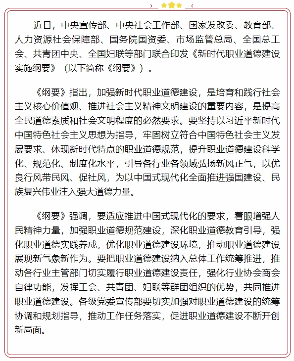 加强新时代职业道德建设,是一项基础工程、系统工程,必须坚持和加强党的全面领导,牢牢把握正确政治方向。要把职业道德建设纳入总体工作统筹推进,作为完善培育和践行社会主义核心价值观制度机制、实施公民道德建设工程的重要任务抓好落实。推动各行业主管部门紧密结合工作职能,切实履行职业道德建设责任,逐步建立健全职业道德行业规范,加强对行业领域职业道德建设的指导和督促。强化行业协会商会自律功能,有效监督职业行为、经营活动和行业风气,推动践行职业道德行业规范。发挥工会、共青团、妇联等群团组织的优势,共同推进职业道德建设。