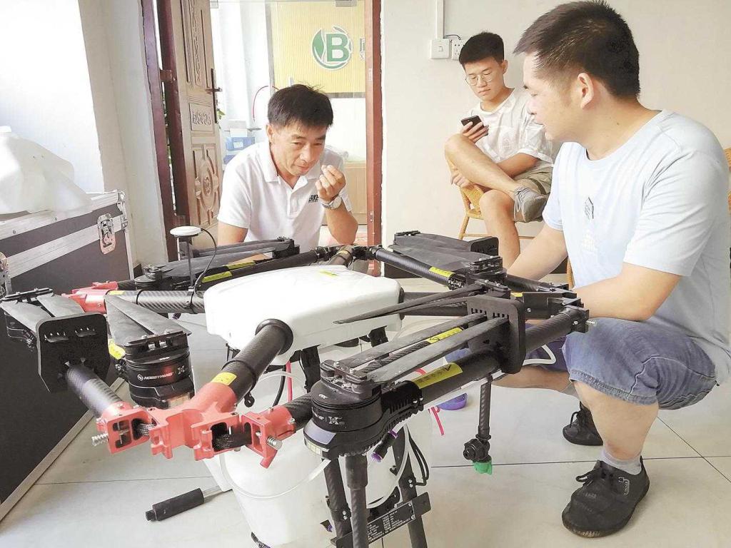 陈克朋(右一)在安装无人植保机。 通讯员 胡剑芳 摄