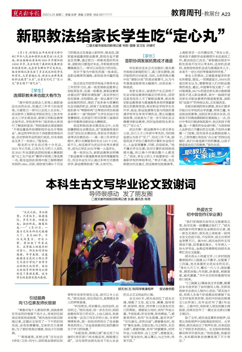 5月1日,时隔近26年来的首次修订的《中华人民共和国职业教育法》正式实施。新法篇幅由原来的3000多字增加到10000多字,充分体现了最新的发展理念和制度创新,也在家长群体中引发热议。极目新闻记者采访了多名武汉职校学生和家长,大家普遍认为,新法从法律角度给职业教育“正名”,让家长们吃了“定心丸”学生喝下“顺气水”。