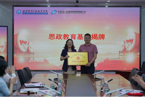 武汉软件工程职业学院副校长孙美华(左)与武汉重型机床集团有限公司党委副书记胡军共同为校外思政教育基地揭牌。