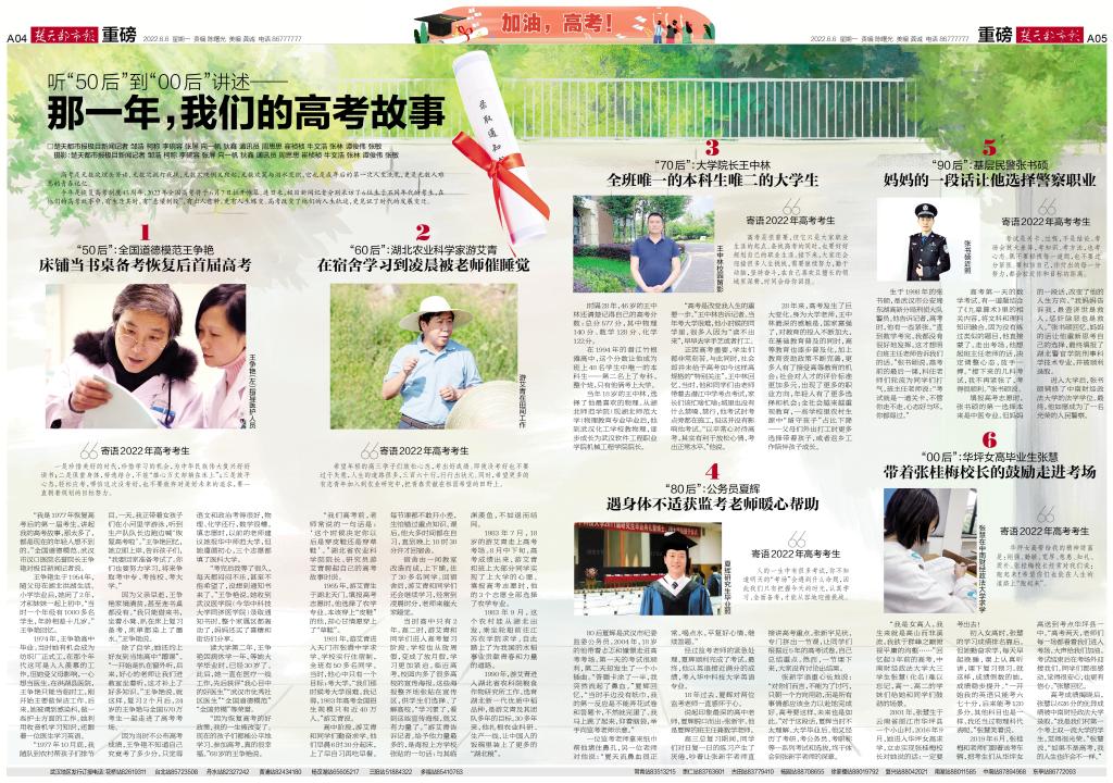 高考如此重要,学生们学习都非常拼命。与此同时,社会却并未给予高考如今这样高规格的“特别关注”。王中林回忆,当时,他和同学们统一由老师带着去潜江中学考点高考,家长该忙啥忙啥;城里也没有什么禁噪禁行,他考试时考点旁都在施工,非常吵,但这并没有影响他考试。“以平常心对待高考,其实有利于放松心情,考出正常水平。”他说。