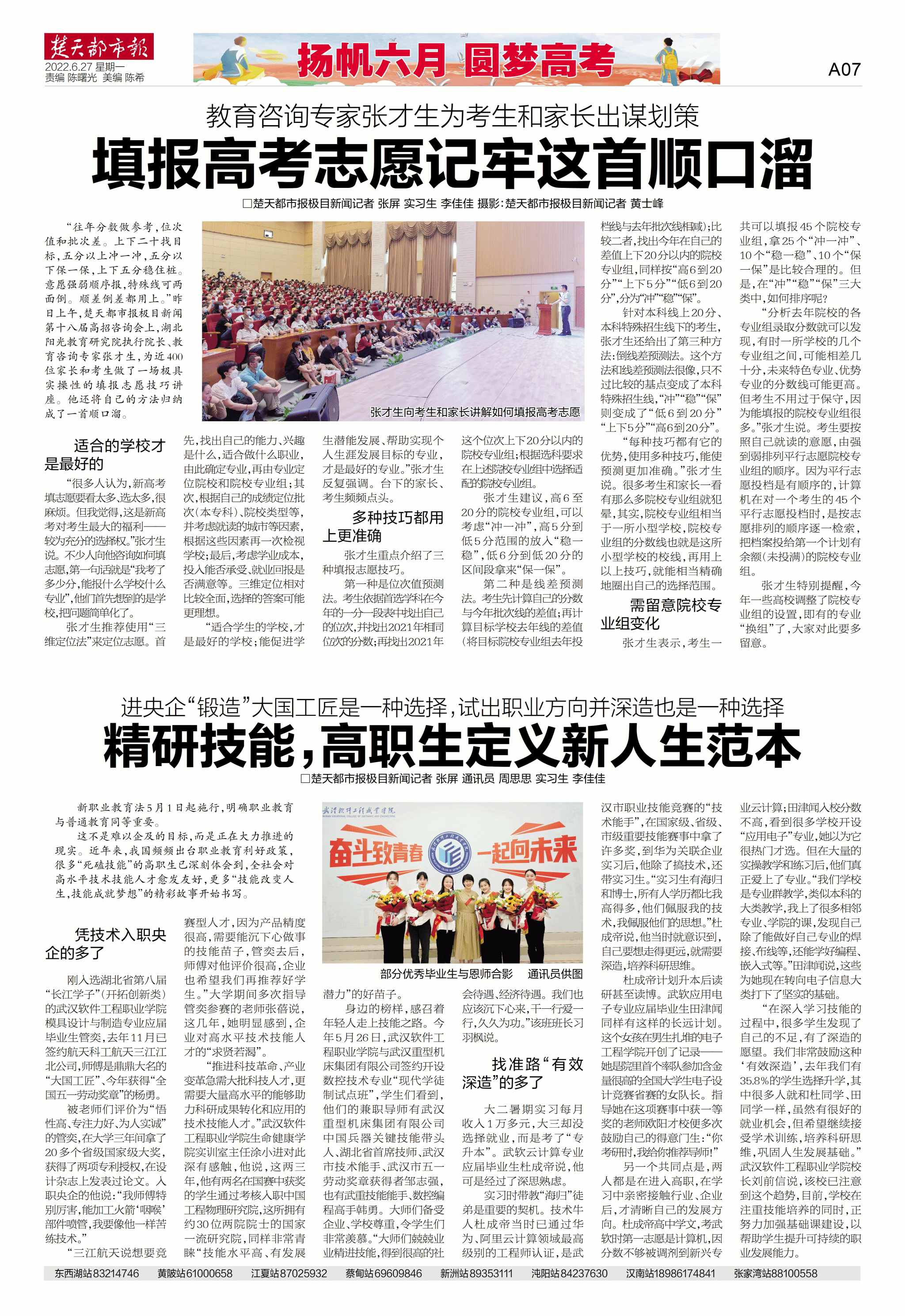 身边的榜样,感召着年轻人走上技能之路。今年5月26日,武汉软件工程职业学院与武汉重型机床集团有限公司签约开设数控技术专业“现代学徒制试点班”,学生们看到,他们的兼职导师有武汉重型机床集团有限公司中国兵器关键技能带头人、湖北省首席技师、武汉市技术能手、武汉市五一劳动奖章获得者邹志强,也有武重技能能手、数控编程高手韩勇。大师们备受企业、学校尊重,令学生们非常羡慕。“大师们兢兢业业精进技能,得到很高的社会待遇、经济待遇。我们也应该沉下心来,干一行爱一行,久久为功。”该班班长习羽枫说。
