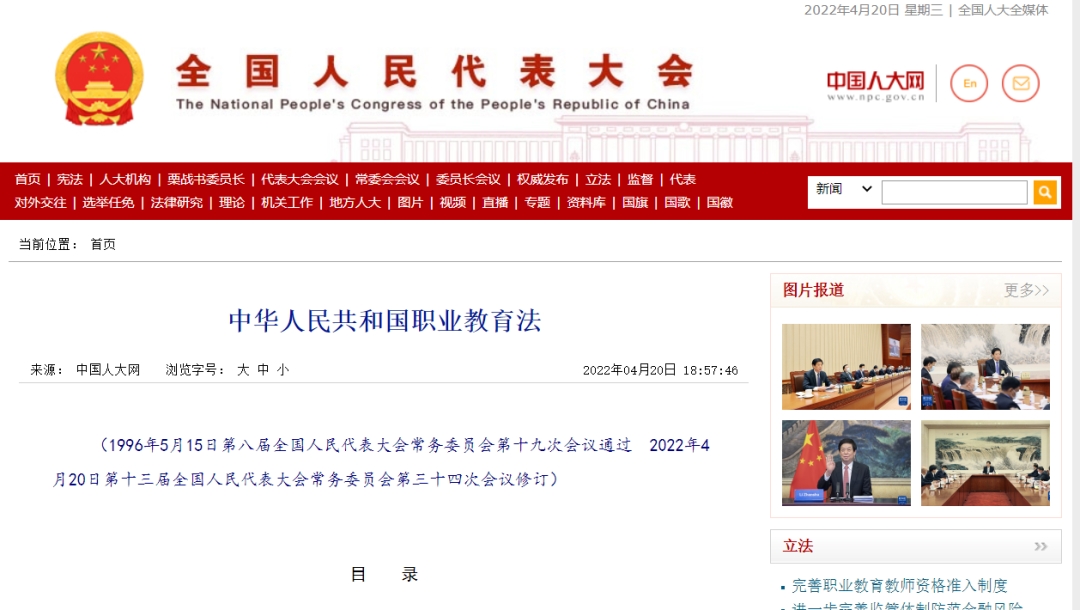 十三届全国人大常委会第三十四次会议4月20日表决通过新修订的职业教育法,2022年5月1日起施行。